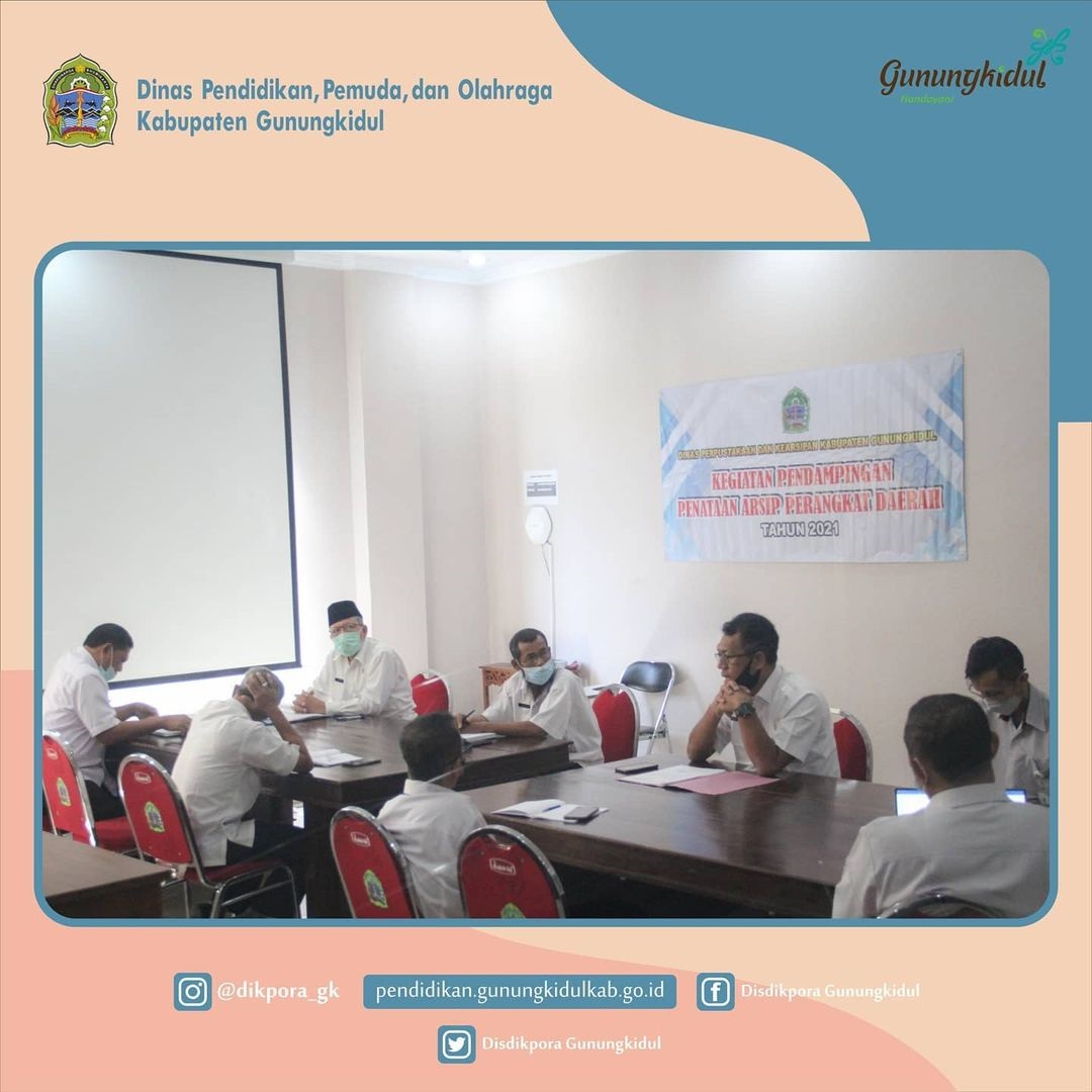 WONOSARI- Dinas Pendidikan, Pemuda, dan Oalhraga (Disdikpora) Kabupaten Gunungkidul menerima kunjungan dari Dinas Perpustakaan dan Kearsipan Kabupaten Gunungkidul. Kunjungan tersebut dalam rangka kegiatan Pendampingan Penataan Arsip Perangkat Daerah. Kegiatan yang di selenggarakan di ruang Sasana Amongkarsa Disdikpora Kabupaten Gunungkidul Di Hadiri oleh Drs. Ali Ridho, M.M. selaku Kepala Dinas Perpustakaan dan Kearsipan Kabupeten Gunungkidul beserta jajarannya, Drs. Sudya Marsita, M.M. selaku Sekretaris Disdikpora Kabupaten Gunungkidul Beserta Jajaranya Kepala Bidang dilingkungan Disdikpora. Kegiatan tersebut juga di ikuti oleh perwakilan Kepala Seksi dan Staf di lingkungan Disdikpora Kabupaten Gunungkidul. Pendampingan tersebut akan dilaksanakan selama 25 hari kerja yang terhitung sejak tanggal 21 April 2021.