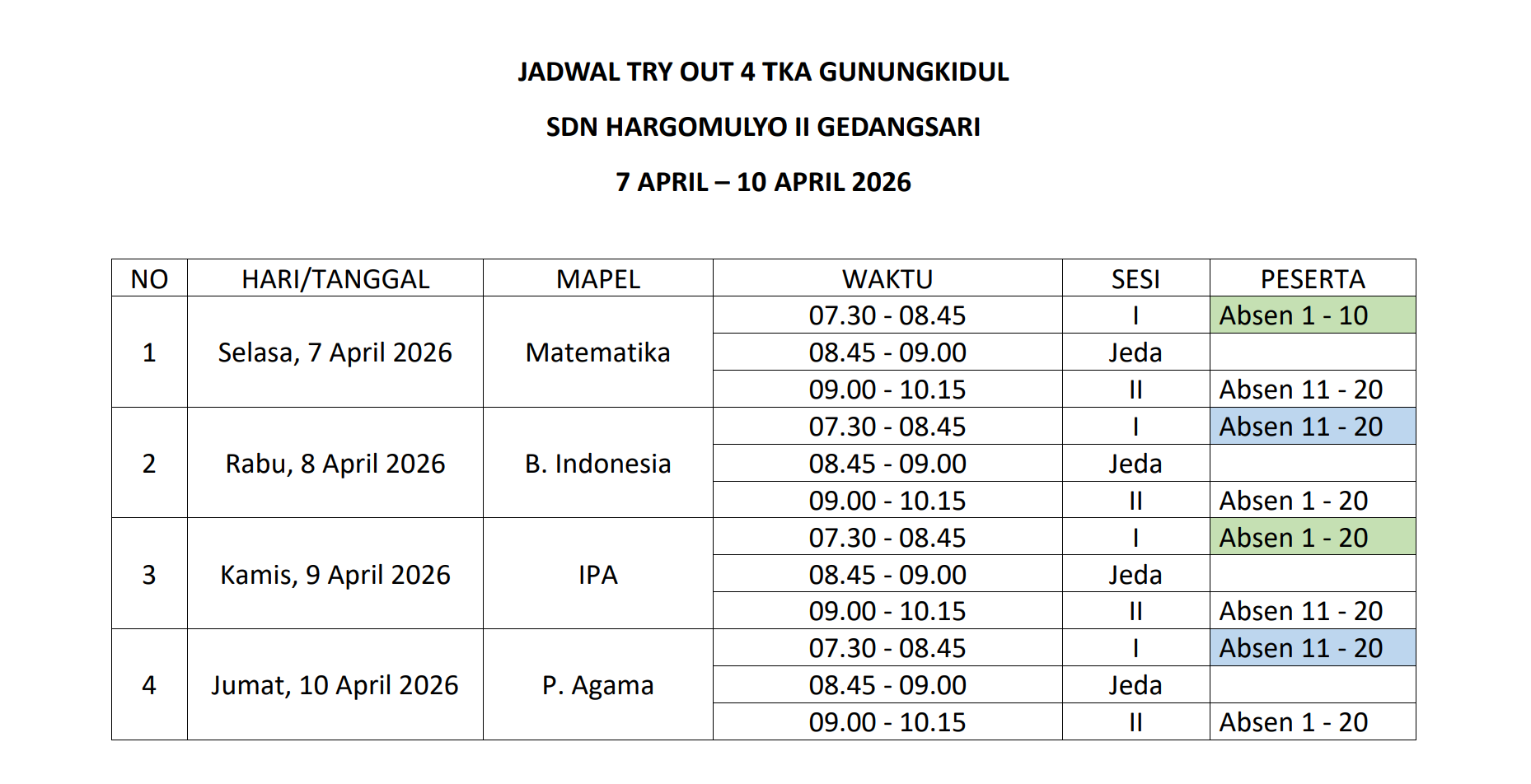 Pelaksanaan TRY OUT TKA ke 4 Kabupaten Gunungkidul ini merupakan pelatihan terakhir bagi siswa sebelum melaksanakan ujian TKA yang sesungguhnya. Karena itu diharapkan bagi siswa untuk belajar dan mengerjakan dengan sungguh-sungguh sebagai acuan untuk memahami pendalaman materi setiap siswa.